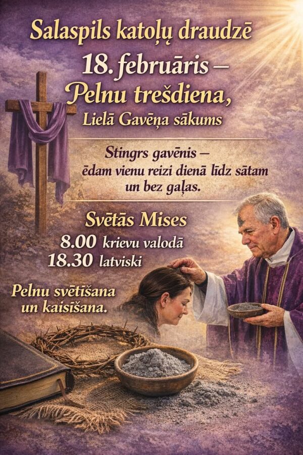 18.februāris – Pelnu trešdiena, Lielā Gavēņa sākums. Stingrs gavēnis – ēdam vienu reizi dienā līdz sātam un bez gaļas. Svētās Mises 8.00 krievu valodā, 18.30 latviski. Pelnu svētīšana un kaisīšana.