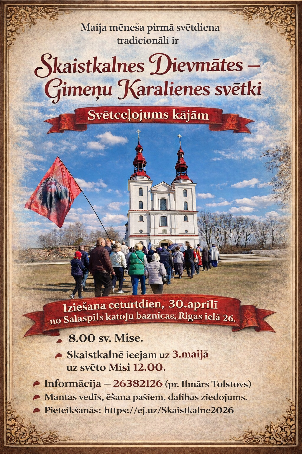 -30. Aprīlī sāksies ikgadējais svētceļojums kājām no Salaspils uz Skaistkalni. Dalība par ziedojumiem, ēšana pašiem, mantas vedīs. Nakšņošana skolās. Pieteikšanās elektroniski.