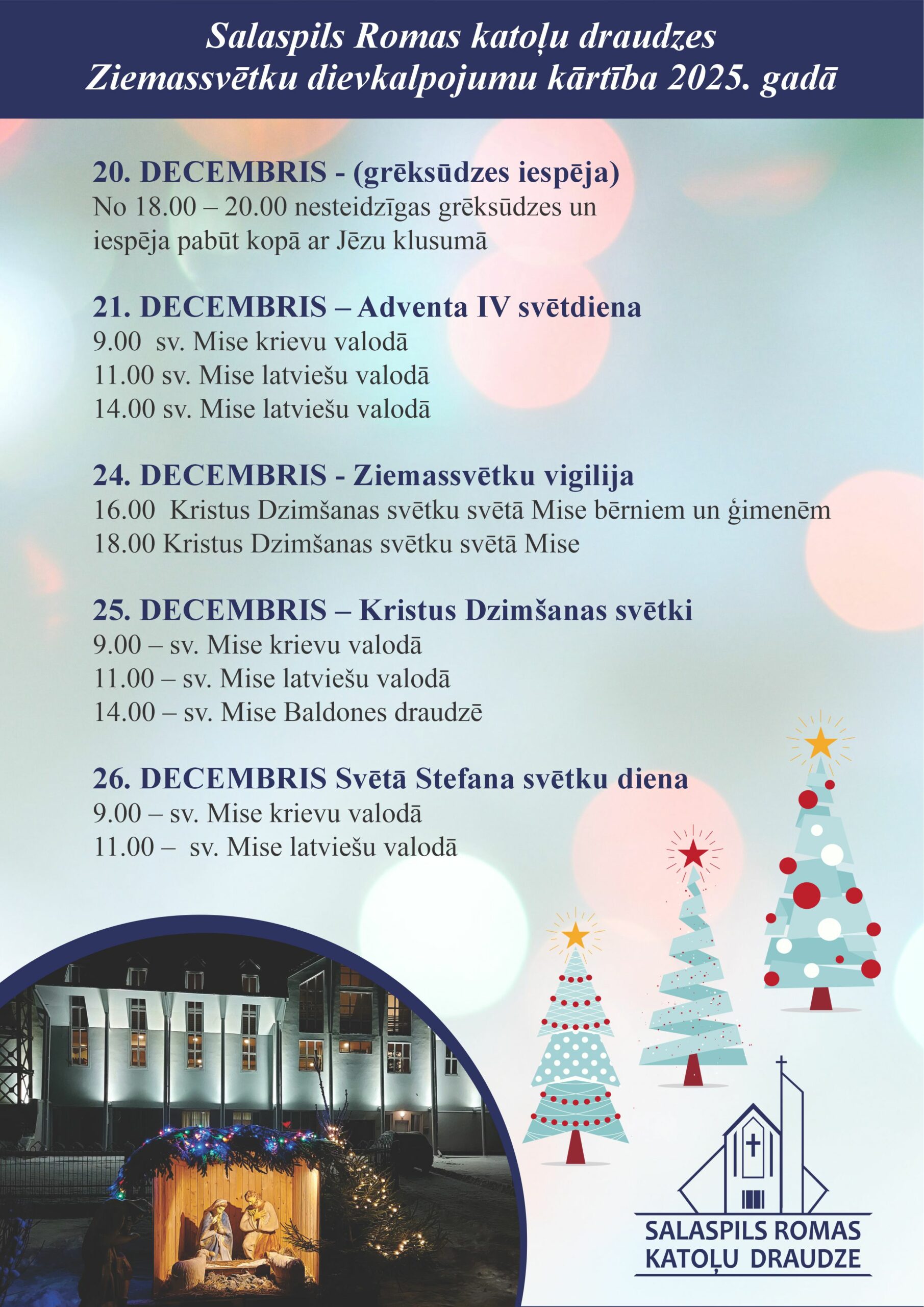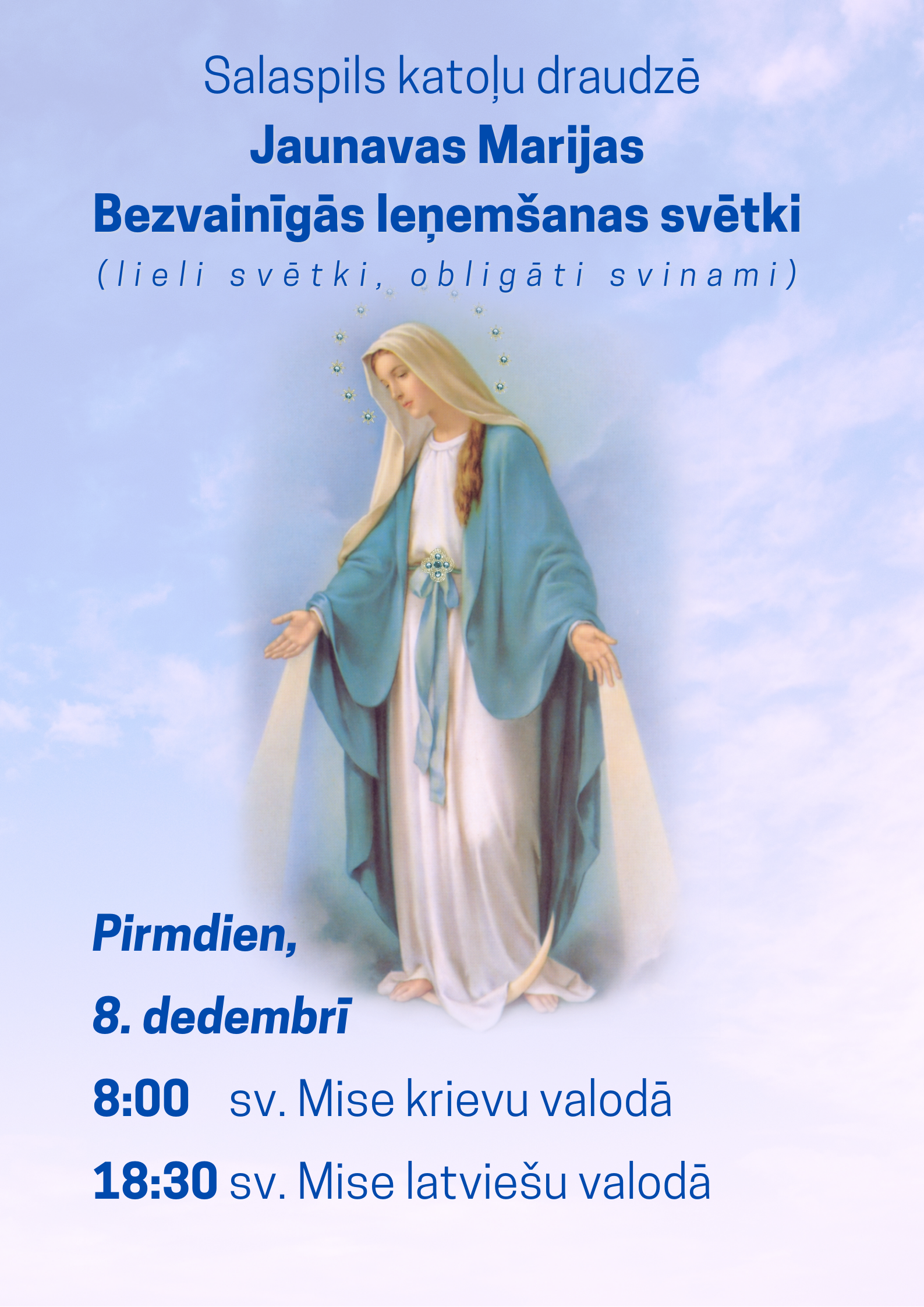 8.decembris – Vissvētākās Jaunavas Marijas Bezvainīgās Ieņemšanas svētki. Lieli un obligāti svināmi. Svētās Mises 8.00 krievu valodā un 18.30 latviski. 6. un 20.decembrī Vissvētākā Sakramenta adorācija no 16:00 līdz 19:30. No 18:00 – 19:30 nesteidzīgas grēksūdzes iespēja.