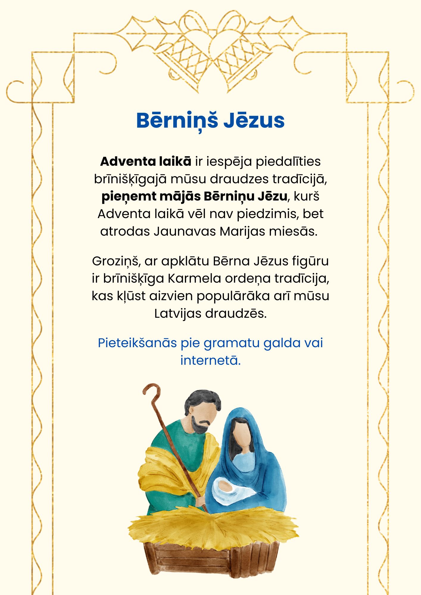Ir iespēja pieteikties Bērniņa Jēzus figūrai mājās Adventa laikā. Pieteikšanās pie grāmatu galda vai internetā.